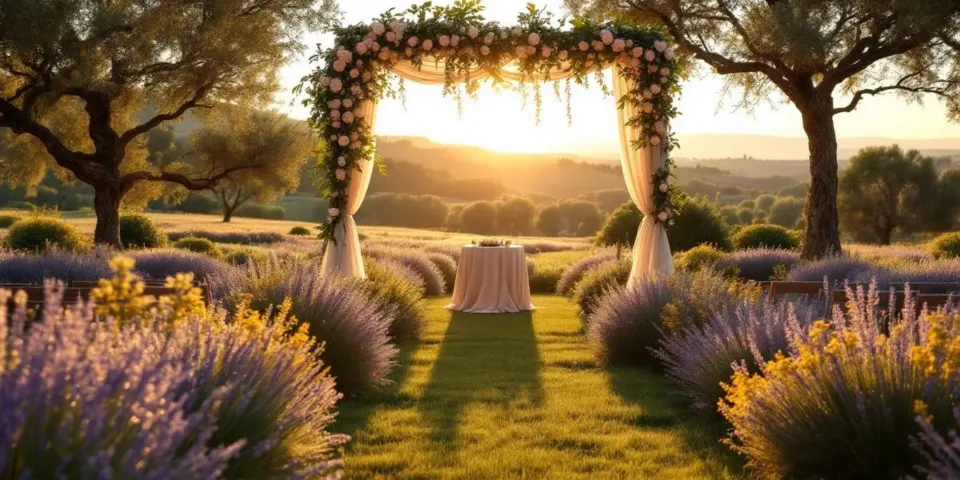 Cérémonie du sable ocre local ou handfasting lavande (10 min). Unique : rituel olivier, planté sur site, ancre union à la terre varoise.